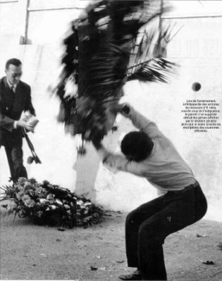 A ma surprise, je vois aussi mon frère Fernand, 20 ans, en train de photographier la scène du drame. Assistant photo dans une boutique du centre de Philippeville, il a été dépêché par un journal pour témoigner du premier massacre perpétré par 300 fellaghas contre des Européens. C'est la première fois qu'il couvre un tel événement. Seule une profonde colère l'a aidé à tenir face aux corps suppliciés. Ce sera aussi la dernière fois : le dégoût l'a emporté pour toujours sur sa passion de jeunesse. J'apprendrai par la suite que les 250 familles arabes d'El Halia avaient reçu l'ordre de se soulever contre les 25 familles d'Européens avec lesquelles elles vivaient pourtant en parfaite harmonie. Toutes avaient refusé de s'attaquer à leurs amis. Aussi, Saïd Babouche, le commissaire politique du F.L.N., a-t-il fait appel aux fellaghas de Sétif, distant de 200 à 300 kilomètres, pour rompre radicalement cette entente jugée inadmissible. Ce 20 août, des assauts de cet acabit ont eu lieu un peu partout en Algérie. Mais aucun n'a atteint cette ampleur, tragique prélude des événements à venir. Peu à peu, l'atmosphère entre Européens et indigènes s'est dégradée. Le F.L.N. avait gagné. Quant à mon beau-père, connu comme l'un des meilleurs fusils de la région, il employait comme jardinier le père de Saïd Babouche. Il a compris plus tard que l'embuscade qui lui avait été tendue émanait directement de Saïd qui lui vouait une haine farouche depuis toujours. Pour nous, par ce massacre, c'est tout notre univers qui s'est écroulé. Après son service militaire dans l'armée, où il faisait des tirages noir et blanc, mon frère a remisé ses objectifs. Quand nous avons pu enfin évoquer ensemble ce drame, il y a seulement six mois, il m'a dit : "C'est le pire souvenir de ma vie..." Tout comme pour moi. Paris Match N°2578 4 avril 2002 ![]() Lors de l'enterrement à Philippeville, des victimes du massacre d'El Halia, sous le coup de l'indignation, le parent d'un supplicié détruit les gerbes offertes par le résident général alors que le maire arrache les inscriptions des couronnes officielles.